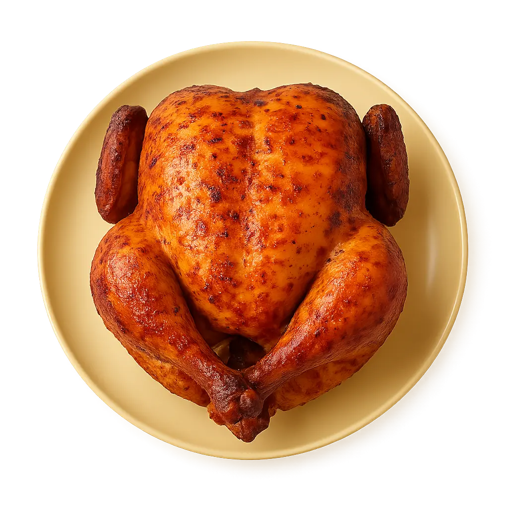 Pollo asado a las brasas con sabor a eleccion, a la naranja , al limon, al merken, a la moztasa, etc,.