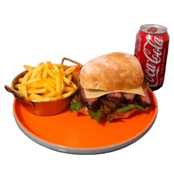 Sándwich de lomo con papas y bebida en lata
