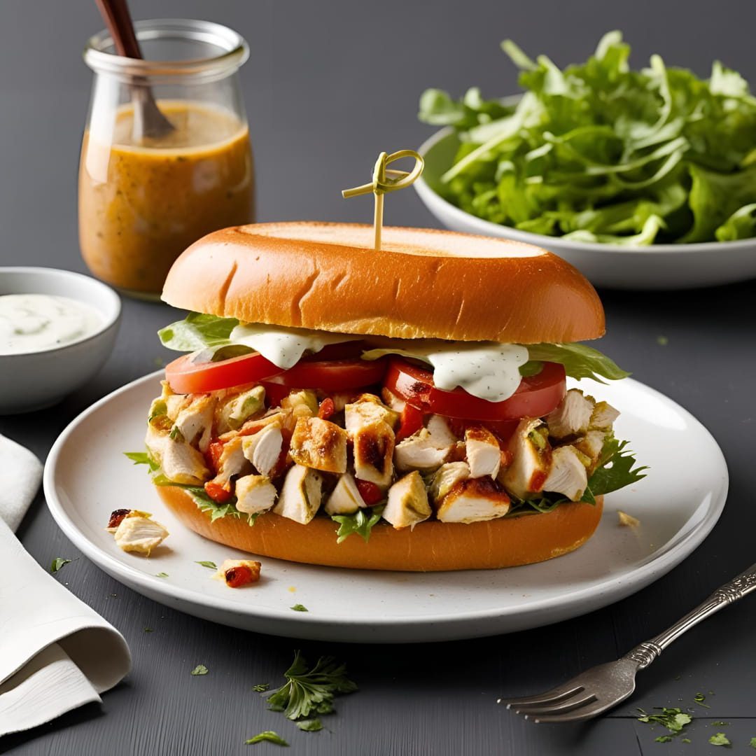 Sándwich de pollo asado trozado con 3 ingredientes a elección y aderezo